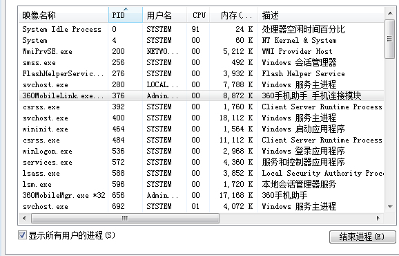 看上图,原来376是360MobileLink.exe,右击结束进程,发现无法结束它,不着急,再看底下还有个进程【360MobileMgr.exe】,先结束【360MobileMgr.exe】,过几秒钟后【360MobileLink.exe】就自动消失了。